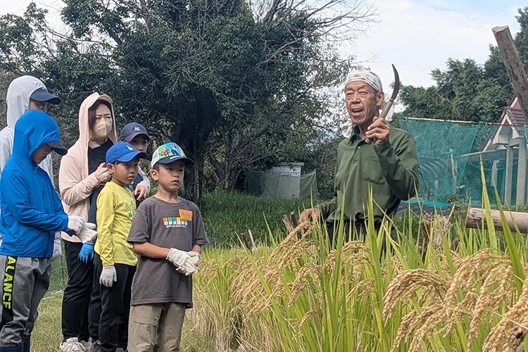 田んぼでは、スタッフの古江さんより、安全に稲を刈る方法、子どもさんでも行いやすい稲束の作り方の説明を受け、いよいよ稲刈りです。