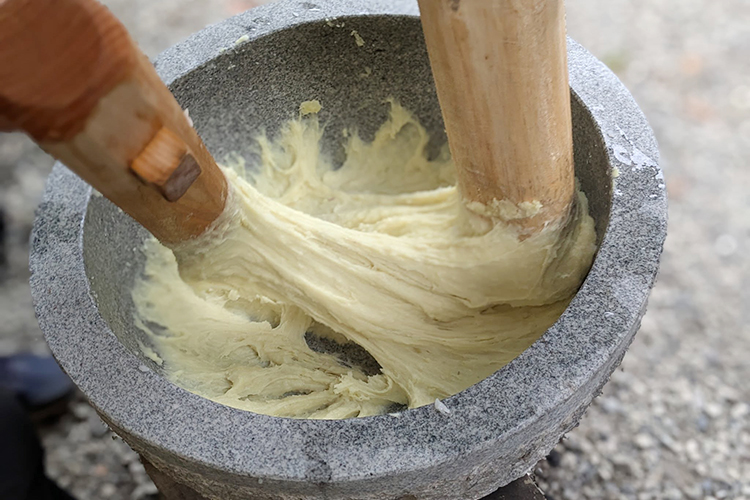 お餅とさつまいもが一体となり、杵を持ち上げたとき、すーっと伸びるくらいになったら出来上がりです。
