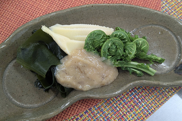 茹でた孟宗竹の柔らかな穂先を薄く切り、わかめと共に酢味噌かけにすると春の味が口いっぱいに広がります。