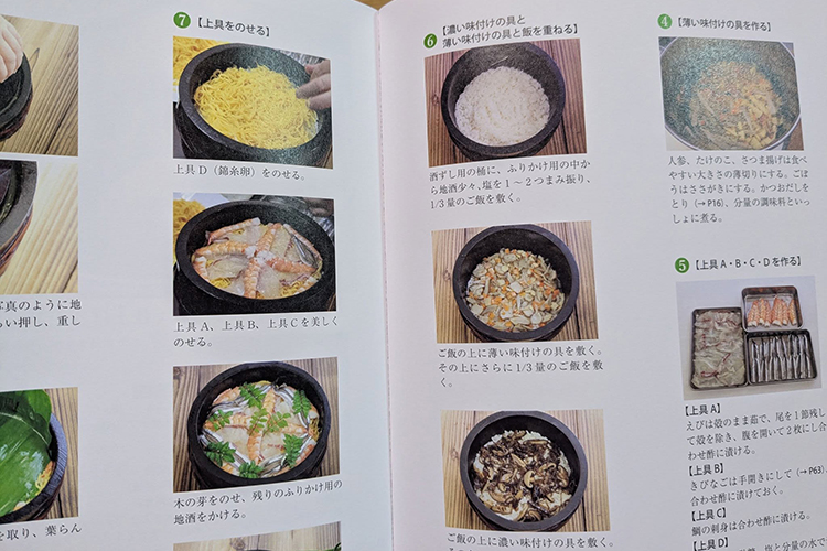 錦江湾の桜鯛、エビ、イカ、きびなごなどを酢〆にした具と、シイタケや人参、タケノコ、さつま揚げなどを甘めに煮たものなど、山海の様々な具材を、酒寿司用の桶に段々に詰めていきます。