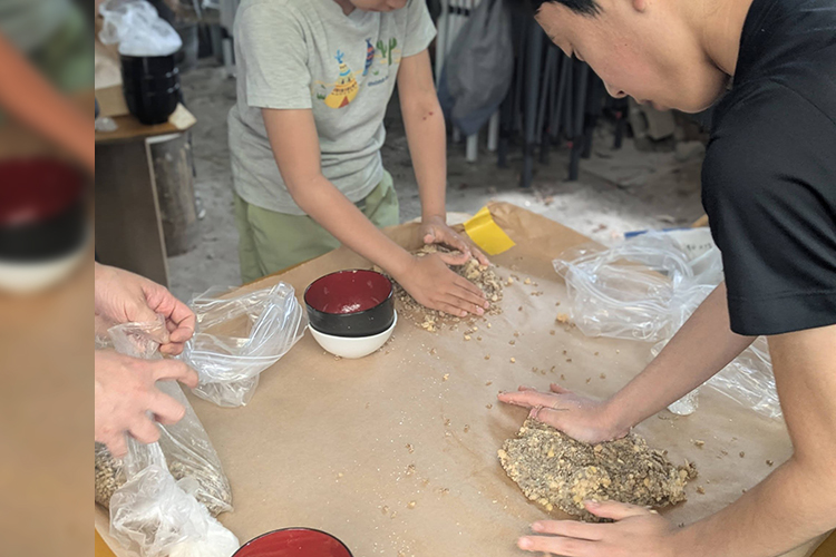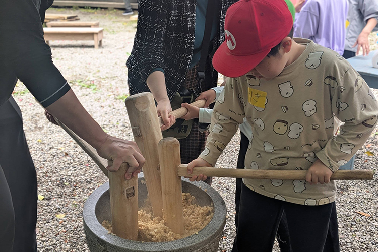 味噌仕込みのまえに「みそつくりの歌」を、スタッフのTさんと参加の皆様に歌っていただきました。