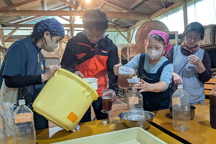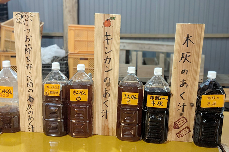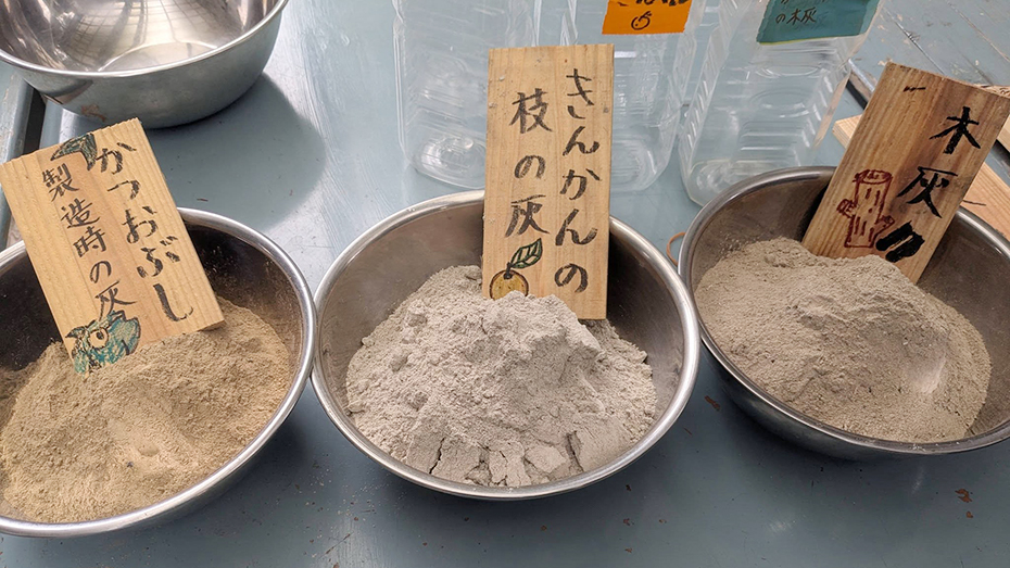 今年は「キンカンの木の灰」「鰹節製造時の灰」「市販の木灰」を使い、一升の灰(1.3キロ)から二升(3.6 L)の灰汁をとりました。