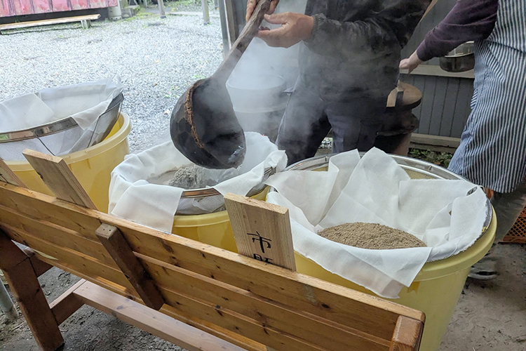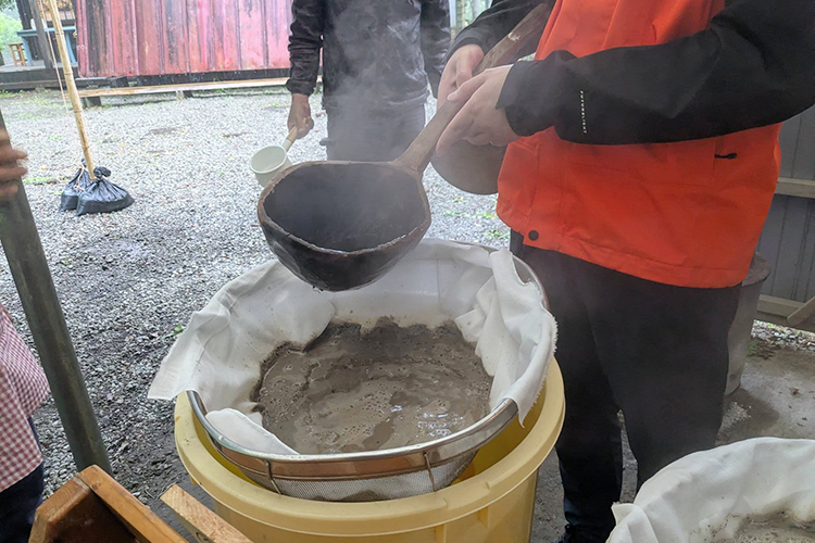 さて、ザルにさらし布を重ねた上に木灰をのせ、羽釜で沸かした熱湯をかけます。
