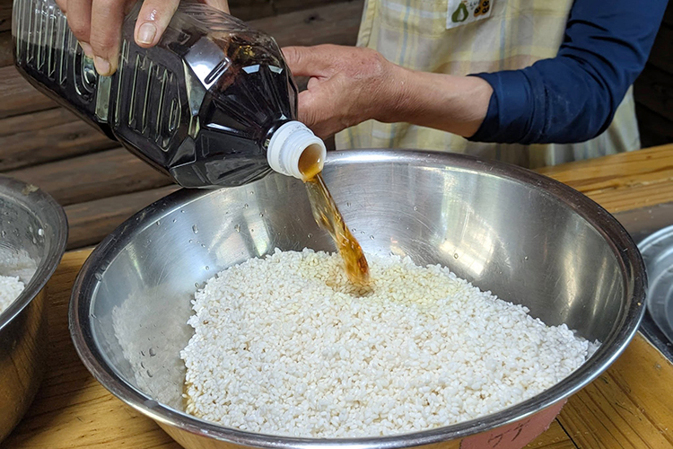 「あくまき全部講座」2日目でした 2026年04月28日2026年04月28日 霧食 4月28日 あくまき全部講座2日目(第216回 霧島たべもの伝承塾)3種類の灰汁に、それぞれ餅米1升を漬けました。竹の皮は水につけ、かまども準備もし、明日はいよいよ3日目の「成形」と「煮方」です。